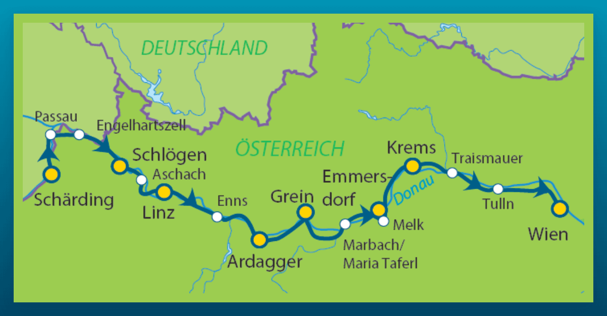 Overnight stops along the way: Passau -> Linz -> Melk -> Vienna